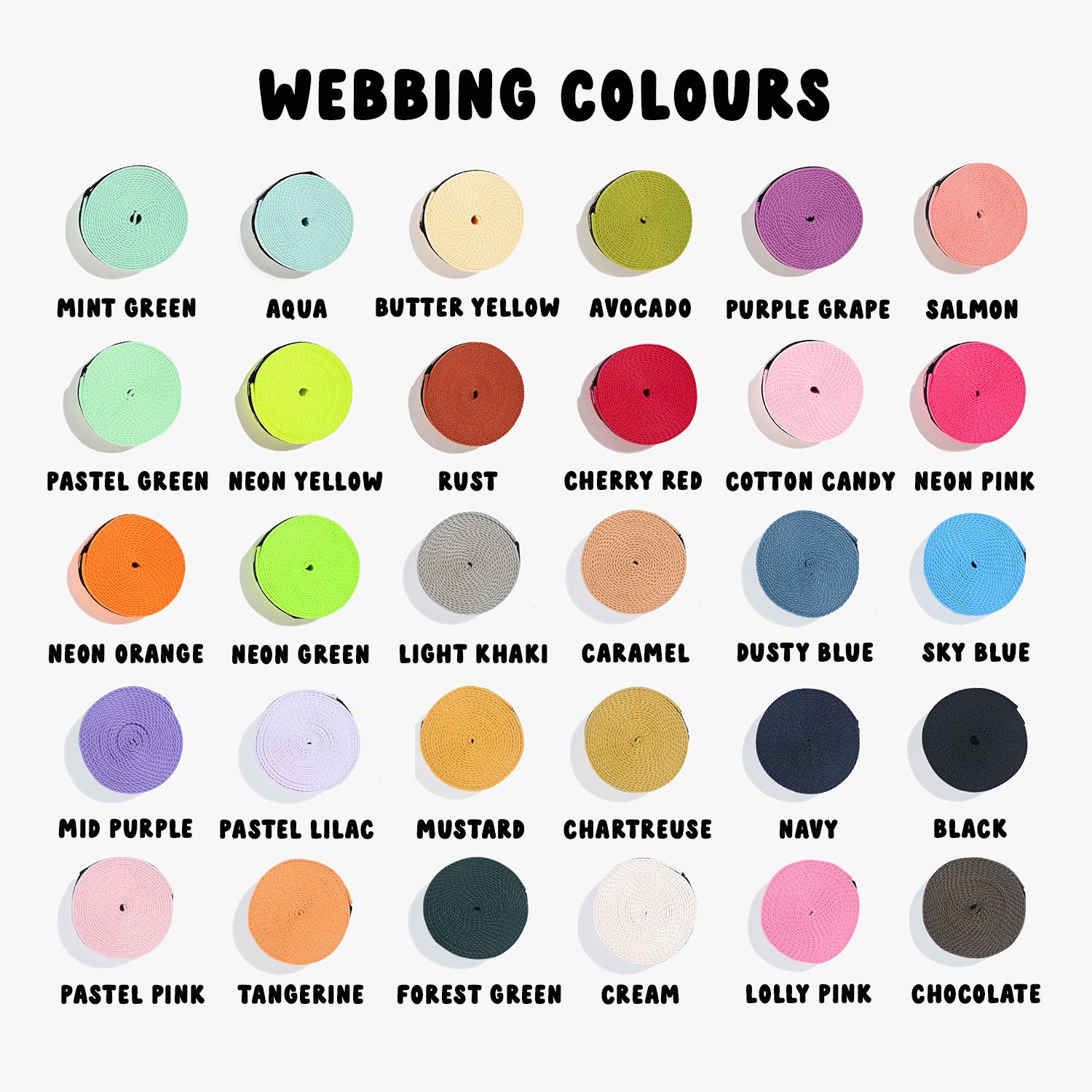 We have curated our very own KATM selection of webbing colours - 17 delicious options!